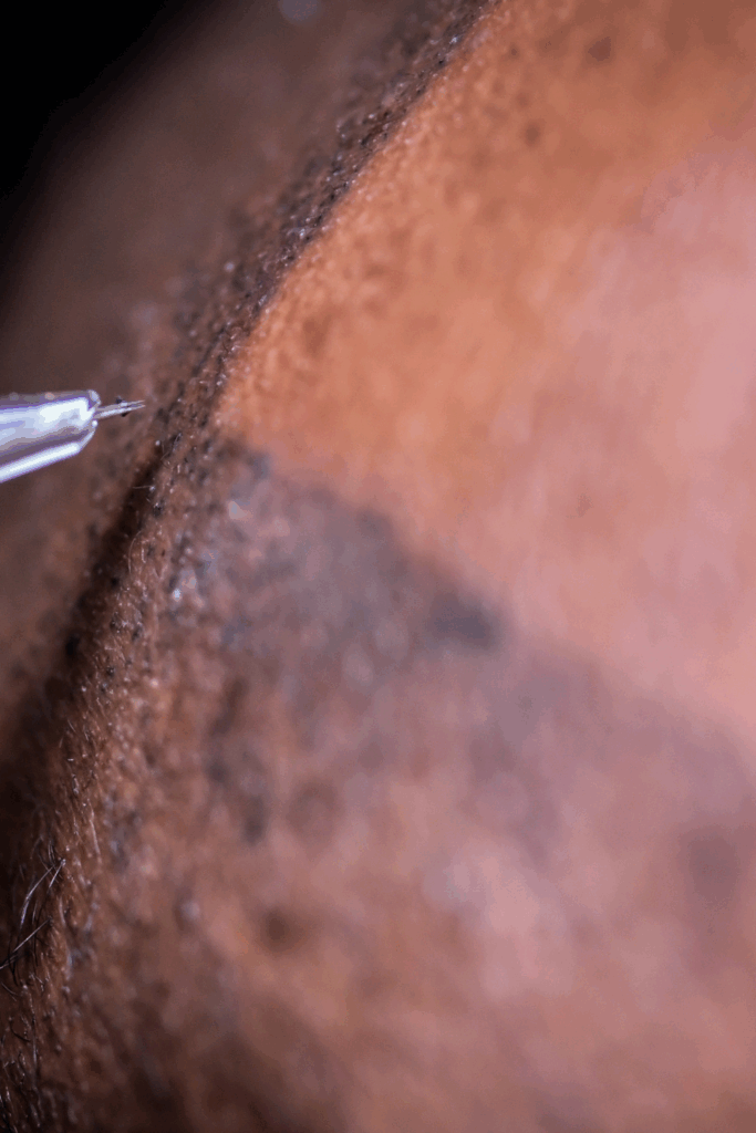 Mit einem feinen Blade – einer kleinen Klinge aus aneinandergereihten Nadeln – werden haarähnliche Linien manuell in die oberste Hautschicht geritzt und mit Pigment gefüllt. Ich arbeite präzise, sauber und mit viel Feingefühl.
